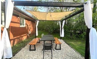 Step into your private backyard oasis! Dine under a charming pergola with seating for six, twinkle lights, and a shade sail. There’s also a charcoal grill and utensils provided, just bring your favorite charcoal and enjoy an outdoor meal in this peaceful setting.