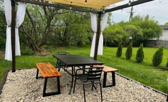 Step outside to your private backyard patio, perfect for unwinding. Enjoy seating for six under a shaded pergola with string lights, a park-style charcoal grill, and a peaceful ambiance. It’s the ideal space for dining al fresco or a laid-back evening under the stars.