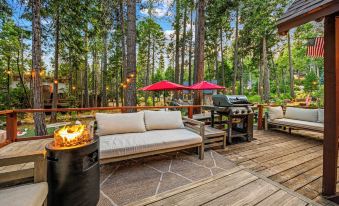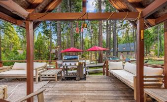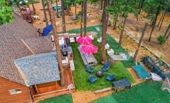 Blue Lake Springs A-Frame Of Mind Cabin in Arnold opens to an inviting great room with kitchen, living room, dining room area with a classic custom cabin wood burning fireplace that adds to the overall charm of the space. The main level of the home features the main entry way, two bedrooms, bathroom, shoe storage and comfortable view of the bunk room above. The open kitchen dining area overlooks the TV area with patio access that includes super plush & comfortable world market couches, chairs, coffee tables and dining tables with benches. Backyard area includes a stainless steel Bar B Que & stainless steel pellet smoker. A recently installed synthetic lawn extends the backyard area enjoyment for a relaxing time for all who stay.