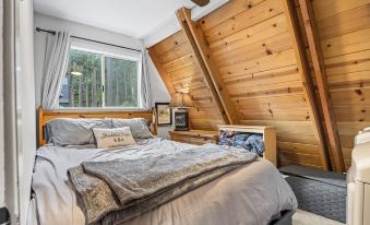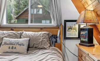 The loft above the garage at the Blue Lake Springs A-Frame Of Mind Cabin in Arnold can be used as an additional “Kids Zone” with a full size pine log bed & bunk bed. The room features a 3 in one game table that has a pool table, air hockey & ping pong. The room also features a new LG 43’ smart TV & a Pac-Man multiple arcade game. Also includes a large dresser, night stand & a small fridge.