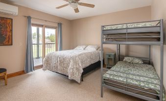 The main bedroom has a queen bed and access to the private deck. The second bedroom is also equipped with a queen and bunk beds. The bunk beds are adult sized with 8" thick mattresses.