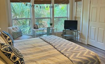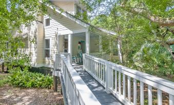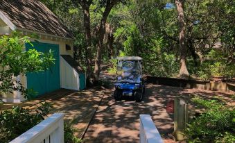 Welcome to Sheltering Oaks, a 3Br/3Ba home in the maritime forest. Our home is just a short walk to the beach (under a quarter mile) and the Maritime Market (about a third of a mile). House is on a quiet cul-de-sac, down a private driveway, and is surrounded by beautiful live oaks and sabal palms. The house features two four person golf carts, a front porch with rocking chairs, a back screened in porch with dining table and rockers, an outdoor shower. The home has an open floor plan with two large bedrooms downstairs (each with attached full bath) and one bedroom upstairs with full bath. Home is equipped with everything you need for your vacation including tvs, dvds, Wii-U, games and puzzles, a record player and plenty of records, boogie boards, beach chairs, bikes, and a Weber grill. Listen to the roar of the ocean from the screened in porch. Upstairs bedroom has a door at top of stairs for added privacy.