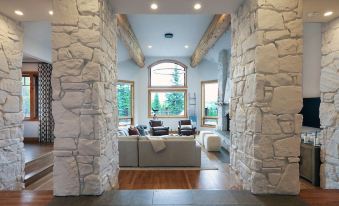 The fully equipped gourmet kitchen is a chef's dream, featuring top-of-the-line appliances and ample counter space. Gather around the large dining table with your loved ones, or cozy up next to the stone fireplace in the comfortable living room after a day of outdoor adventures.