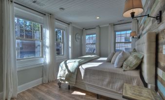 This renovated 1BR/1BA modern mountain studio is designed to provide a relaxing and cozy atmosphere. It combines the comfort of home with soothing color schemes and a touch of retro decor. Professionally designed & decorated by Nathan Fitts & Team, the building owner & host, known and accredited with some of the best "modern rustic" designs in the North Georgia Mountains. With ample natural light from surrounding windows, this suite is conveniently located in the heart of historic downtown Blue Ridge, Georgia. It features an open floor plan with a spacious king-size bed, a living room area, wet bar/coffee bar and large bathroom. This studio has it's own ductless heating and air conditioning system allowing you to set and control your comforts. Other amenities include large 60" LCD smart TV featuring all the cable and sports channels or allowing you to stream, USB/charging ports, alarm clock and the bar doubles as a wet bar and coffee bar featuring a retro mini refrigerator/freezer, microwave, Keurig coffee maker stocked with a variety of coffee flavors both regular and decaf, creamers and sweeteners, a hot plate for cooking, toaster oven, blender, mixer, basic cookware, silverware, glassware and dishes, martini glasses, wine glasses, Moscow mule mugs, a shaker set, wine opener & more...Complimentary WIFI is also offered on a secure network and an iron/ironing board and clothes steamer are provided for your use. Completely modernized bathroom features large walk in subway tile all glass shower with tiled floors. All linens are provided and complimentary guest amenities are provided including soap, shampoo, conditioner, body wash, lotion, Q-tips, and make-up remover kits. A laundry facility for guests to share is also available across the hall should you need to laundry clothes or there is a laundry/dry cleaning pick up and drop off service you can set up. Our suites are pet friendly with a limit of 2 pets per suite and there is a one time pet fee per stay.