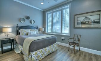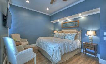 King Master Bedroom with a 42" Flat Panel TV, and attached bathroom with large tiles shower boasting 3 shower heads, a separate tub, and double vanities Queen Bedroom with 42" Flat Panel TV, and attached bathroom with tub/shower combo and single vanity.