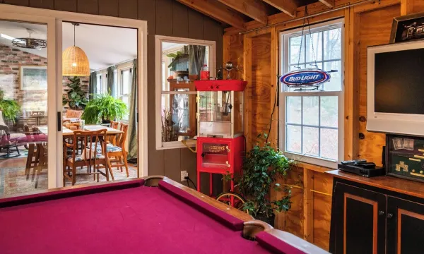 Welcome to a uniquely Adirondack and freshly updated playground for family and friends! Find a cozy fireplace, an inviting dining sunroom, a pool table room and bar.. the stage is set for great gatherings! With hot tub, fire-pit & woodland pathway, the private backyard boasts outdoor kitchen, fit for a professional chef & team of prep cooks! Alfresco is at its best with grill, smoker, fridge, wet bar, stadium seating. Bumble your bear family in and make this enchanting experience yours!About pets:Pets allowed: dogs (limit 2 total).About checkOut:Check out before 10:00 AM.About children:Children allowed: ages 0-17.About checkIn:Check in after 4:00 PM.About smoking:Smoking is not permitted.About minBookingAge:Minimum age to rent: 25.About events:Events allowed: family gatherings and birthday parties.Maximum event attendees: 12.