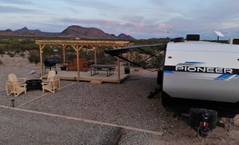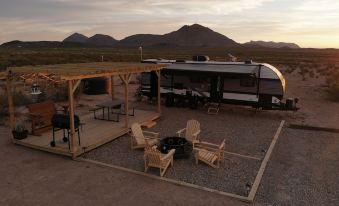 Welcome to Starlight Sanctuary! Nature, tranquility, and comfort come together to create an unforgettable experience in this intricately designed getaway location. Only twenty minutes away from Big Bend National Park, this unique off-grid site is surrounded with 360° of epic views of the Packsaddle Mountain, Mine Point Mesa, Camels Hump, and Red Bluff! During the day, enjoy the sounds of nature and wildlife in comfort. At night, relax under the coal dark starry skies on the romantic pergola.