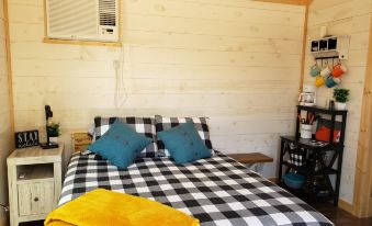 The Fern Cave, named after a hiking destination in Caprock Canyons, is a small (approximately 14’ x 18’) tiny cabin. It is a studio-style cabin, furnished with a queen-size bed and twin bunk beds. It sleeps 4 people. It has a bathroom with a shower, sink, and toilet.