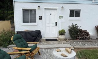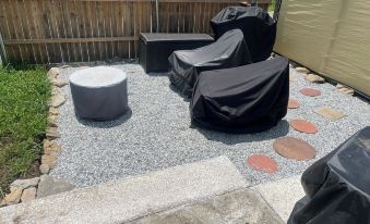 There is a propane bbq on the upper side with a picnic bench that guests can use and parking enough for large trucks like a f250 and another car. Trailer parking is available across the street for a fee. Guests can reserve access to the other parking area through the 3rd parties website truckrvstorage dot com