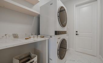 The living room is bright and airy with plush seating, sleek decor, and a large TV for cozy nights in. Each bedroom also features its own TV, and the open-concept layout ensures that dining, lounging, and connecting with your group feels seamless and natural.