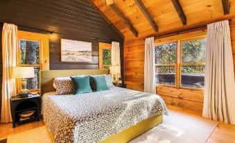 The cabin features 2 bedrooms and a loft area. The master bedroom has a king size bed with a brand new walk in shower. The second bedroom is also on the first floor and features a queen size bed with a bathroom right outside the bedroom door. The loft area features a trundle bed that has two twin beds. The main living room features soaring ceilings with wood beams and a wood burning fireplace, perfect for watching movies. The fully stocked kitchen has everything you possibly would need to prepare wonderful gourmet meals. The kitchen has brand new quartzite honed countertops, a separate island that seats two and a large dining table that comfortably seats 6. The entire home has been newly furnished with beautiful furnishings that are modern but yet still cozy.