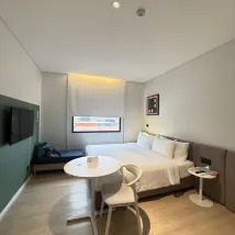 The place is good and inside some is very clean, big bed like 5 foots and have enough space for relaxing. Only few thing is refrigerator is very small that can only put a bottle inside and bathroom door have a space between the space that make all the sound and smell may come-out.