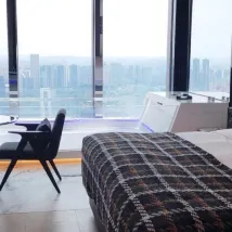 كانت الغرفة نفسها مُريحة بفضل تصميمها المُريح، وآلة نسبرسو، وجهاز عرض مع نظام صوت، وإطلالة خلابة على أفق تشونغتشينغ. كان نظام الستائر مدروسًا: مزيج من الستائر الشفافة والستائر المعتمة منحني الخصوصية وإضاءة طبيعية جميلة طوال اليوم.