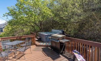 • Deck with large gas grill, 6 chairs, large and small table, large hot tub and snowboard bench. Elevated deck offers privacy from nearby units.