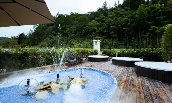 In design, it blends natural aesthetics with modern comfort. Each room has an independent private hot spring and full-floor-to-ceiling glass windows, letting you enjoy mountain-stream views while soaking. Voice-controlled smart features adjust lights, curtains, AC and TV—ensuring constant comfort year-round. Also, there’s a rooftop open-air hot spring for stargazing and valley views, plus a courtyard with pines, bamboos and flowers. The popular rooftop booths are perfect for tea-brewing by the stove, watching rain or listening to wind. Every spot feels cozy, adding immersive natural relaxation to your trip.