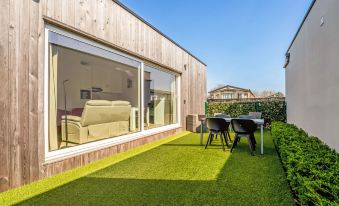 New Dahlia park: Modern, comfortable holiday development. Bredene, 750 m from the sea, 750 m from the beach. Supermarket 2 m, shopping centre 6 m, restaurant 800 m, bar 30 m, bakery 400 m, bicycle rental 2 km, tram "Renbaan" 550 m, bus stop "De Lijn" 550 m, railway station "OOstende" 8 km, sandy beach "strand bredene" 500 m. Surf school 3 km, minigolf 2 km. Nearby attractions: Fort Napoleon 6.5 km, wekelijkse markt op dinsdag 2 km, Jumpsquare Oostende 4.5 km. The owner does not accept any groups. The keys‘ handover takes place by the agency Interhome in Bredene. "New Dahlia 15", 3-room chalet 44 m2. Comfortable and modern furnishings: open living/dining room with dining table, digital TV, international TV channels and air conditioning. Exit to the terrace. 1 double bedroom with 1 double bed (160 cm, length 200 cm), hand-basin, shower/WC and air conditioning. Exit to the terrace with 2 beds (80 cm, length 200 cm), hand-basin and shower. Open kitchen (dishwasher, 4 induction hot plates, toaster, kettle, freezer, combination microwave). Heating. Terrace furniture. Facilities: hair dryer. Internet (WiFi, free). Parking (1 car). Please note: non-smoking house. Maximum 1 pet/ dog allowed. Smoke alarm, fire extinguisher.
