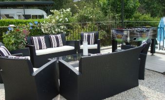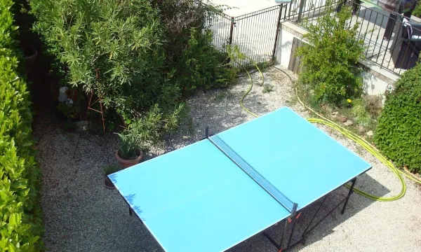 Outside a private terrace with garden furniture (table, chairs, parasol and barbecue)