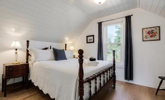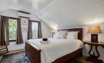 Head upstairs from the living room area to the two cozy bedrooms each with queen-sized beds. The bedrooms share a fully remodeled bathroom with a new vanity, lighting, and shower tub combo. Each bed comes with comfortable pillows, linens, and warm blankets. The bathroom is stocked with soft fluffy towels, locally sourced bath soap, shampoo and conditioner, and a hairdryer.