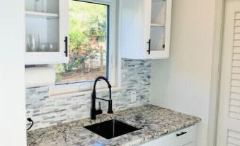 Is a repurposed one trip shipping container into high-end modern studio cottage. 1 Queen bed-Maximum 2 People full kitchen, full bathroom, Fenced yard, private parking. outdoor bamboo shower in a tropical setting.