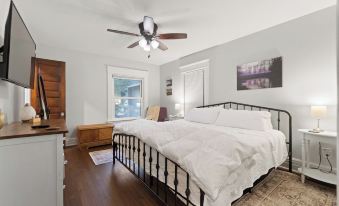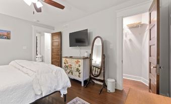 Up the stairway, you'll find a fresh and bright bathroom with luxurious tile shower. Your bedroom is furnished with a cozy, medium-firm, king-sized bed with plenty of pillows and high-end bedding. Our guests have told us how hard it is to get out of bed in the morning! The walk-in closet provides a shelf just for your luggage. You'll also find plenty of hangers, a full-sized ironing board, iron, and portable fan there for your convenience. Enjoy a movie on the large Roku Smart TV as you drift off to sleep.