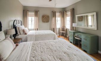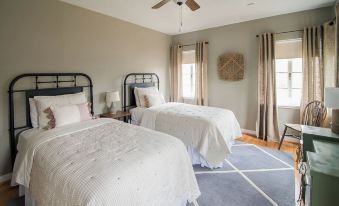 The home, like many in FBG, older homes has charm and quirks. When the home is quiet, you can hear the climate system and some floor creaks. There are steps down to the back bedroom, laundry room and the back yard. The decor is simple, not fussy. Families with any ages would like Haven Haus.