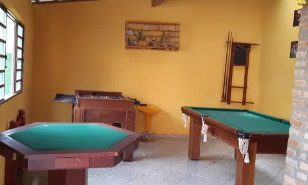full kitchen with fridge, cooker, microwave and household items, play area with bathroom with shower, internal bathroom with shower, 2 refrigerators with freezer, barbecue, wood burning stove, games room with pool and foosball table and card, swimming pool 10x5, with waterfall and hydro, parking for 10 cars, soccer field, playground for children up to 10 years, all surrounded by nature.