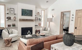 This Cottage features a private entrance, large living space, 2 inviting bedrooms (1 queen with en-suite full bathroom, 1 king bed), 2 full baths, a small kitchen and private patio area. Please note: the bathrooms are small but beautiful! The kitchen features a double induction burner, small oven/air fryer/toaster combo, coffee maker, microwave, small refrigerator and water drinking dispenser. Electric fireplace, wireless internet and WIFI enabled app based flat screen tv's in the main living room and both bedrooms.