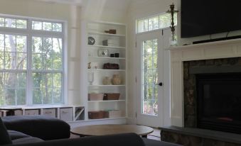 Step inside and instantly feel at home in this inviting, sun-filled cottage. The open-concept living area is a welcoming space with a large plush sofa, a fireplace and large windows that frame the beautiful views of the surrounding greenery, making it a perfect spot to unwind with a good book, enjoy family game nights or relax after a day of exploring.