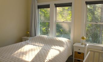 Each of the three bedrooms is a sanctuary of tranquility. Upstairs, you'll find two sun filled rooms with queen size beds, ample storage, cribs, cozy linens and the feel of being home. There's a shared bathroom with a walk-in shower, a clawfoot bathtub and clean finishings. Downstairs, you'll find a large and fully equipped ensuite with a patio opening to the lush greenery and outdoors.