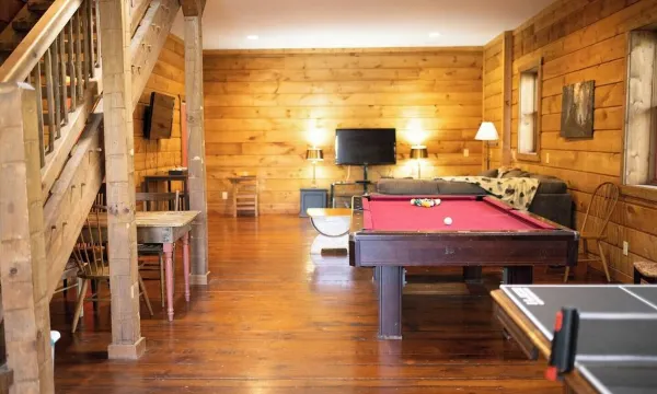 The lower level is perfect for groups featuring a large main gathering room with a large L-shaped sofa. There are two bedrooms and two full bathrooms on the lower level. The library room consist of one Queen bed and its own bathroom. The other bedroom has two full beds, with no attached bathroom. The lower level also has a large porch with a 4–6-person hot tub and rocking chairs.