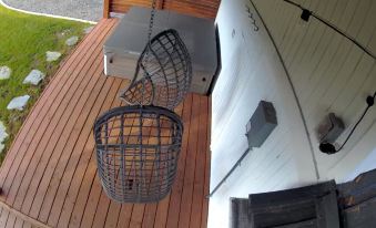 The outdoor amenities at The Spruce House are designed to enhance your experience. You can enjoy the covered barbecue station, relax in the 4-person hot tub, sway in the swinging chairs, or gather around the outdoor fireplace with comfortable seating for conversation. Whether you prefer al fresco dining on the covered veranda or roasting marshmallows under the starry sky with twinkling lights overhead, you'll find the perfect place to rejuvenate your spirit amidst the beauty of nature.