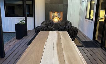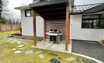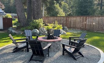 Outside, you'll find a covered barbecue station, a 4-person hot tub, swinging chairs, and an outdoor fireplace with conversational seating. Whether you prefer al fresco dining on the covered veranda or roasting marshmallows under the stars with twinkling lights overhead, the outdoor spaces provide the perfect setting to refresh your spirit and connect with nature.
