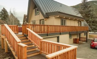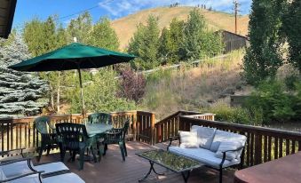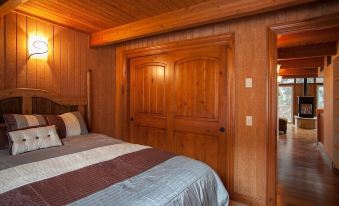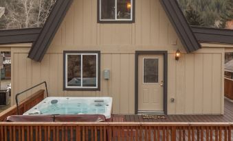 The second floor has a large living room, two bedrooms and a full bath. The living room has the A-frame double height ceiling, thermostat controlled gas fireplace, a wall of windows and a balcony overlooking trees on the side of mount Baldy, a wet bar, and access to the deck with the hot tub. The first bedroom has 2 twin size beds and direct access to the deck while the second bedroom has a queen bed. The bathroom has bidet and a large steam shower.