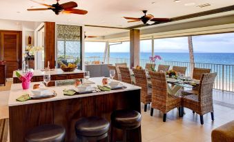 The gourmet chef’s kitchen has everything you need for easy entertaining, including two full-size refrigerators, a dedicated ice maker, and plenty of counter space. At mealtimes, gather in the ocean-view dining area; the 10-seat dining table has enough room for everyone.