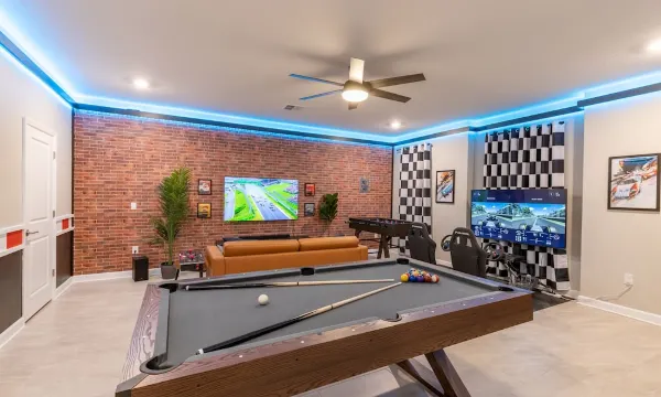 • Game Room with GranTurismo Racing Sim, Pool Table, Foosball Table, and more!