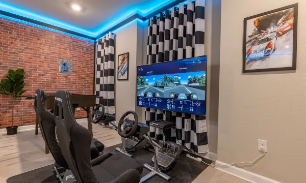 Our house features high quality Italian furniture and luxury bedding. Top of the line technology includes a 75 inch Sony 4KTV with a 400 Watt Dolby Atmos soundbar in the living room, fully equipped game room with a 65 inch Sony 4KTV running a GranTurismo Racing Simulator, and another 65 inch Samsung 4KTV for watching sports or gaming on your own console! Bring your own console!