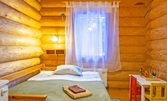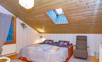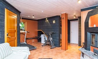This three-story log villa, handcrafted from logs in 2000, offers a well-designed layout. The main floor features a spacious living room, kitchen, a bedroom with a sofa bed for two, a bathroom with a WC and shower, a utility room, and a balcony.