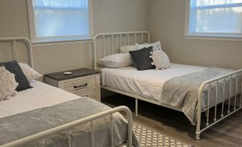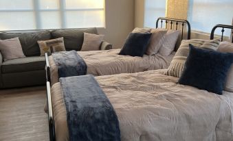 Each bedroom is newly furnished with comfortable beds, plush linens and new flat screen TV’s. Fast internet and a smart TV subscription includes Peacock TV and all your favorite streaming. The master bedroom boasts a king size bed and ensuite bathroom. The second bedroom comfortably provides two full beds. The third bedroom is made cozy with a queen size bed. The fourth bedroom stays cool with a dedicated AC unit, two twin beds and a couch for kicking back. The living room sectional hides a pull-out sofa bed. The quiet area and expansive rooms can sleep 8-10 guests with a total of 6 beds.