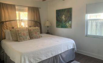 Inside, tasteful tropical and nautical decor creates a laid-back, beachy vibe. The home comfortably sleeps 6 guests: two bedrooms with king-sized beds, plus a sun-filled entry parlor with a daybed and two twin mattresses (note: not a private bedroom).