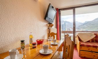 Residence "Chavière", 8 storeys. In the centre of La Croisette, directly by the skiing area. In the complex: lift, storage room for skis, central heating system. Public parking. Shop, supermarket 10 m, bus stop "Gare routière les menuires" 100 m. Sports centre 30 m, skisport facilities, slopes, ski school 20 m, ski-kindergarten 50 m. Well-known ski regions can easily be reached: 3 Vallées. Please note: the photograph shows a typical example. Additional accommodations can be booked. "Chavière 617", 1-room studio 24 m2 on 6th floor, south facing position. Beautiful furnishings: living/dining room with 2 pull-out beds (4 x 80 cm, length 190 cm), TV (flat screen). Exit to the balcony. Kitchenette in the entrance (2 hot plates, mini-oven, dishwasher, kettle, microwave, electric coffee machine). Bathroom, sep. WC. Balcony, south facing position. Very beautiful view of the mountains and the ski run. Facilities: Internet (WiFi, extra). Please note: smoke alarm. 73257005225WF