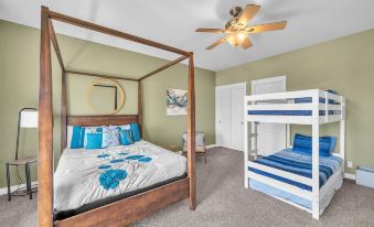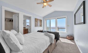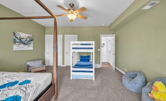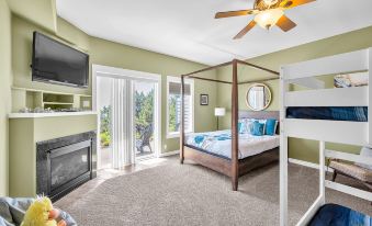 Retreating to the lower-level suite is a delightful experience. With a cozy fireplace enhancing the ambiance, couples can unwind in a dreamy King bed while listening to the soothing sound of the ocean through their patio doors. For those with children, there's a nearby bunk bed and a convenient full bathroom.