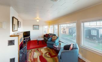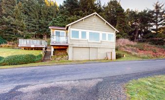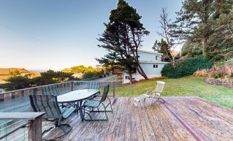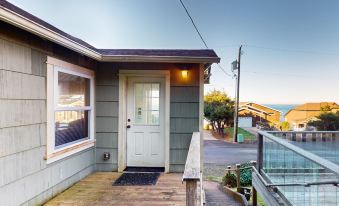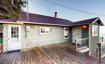 This oceanside vacation rental boasts wonderful ocean views and a massive deck overlooking the sea. With art deco lighting, a cozy fireplace, and an unbeatable location for whale watching, this dog-friendly home is ready-made for Oregon Coast family reunions or group getaways.