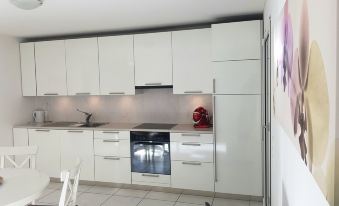 The apartment has a kitchen with dishwasher, oven, fridge and freezer. There is also a closet inside the apartment with washing machine.