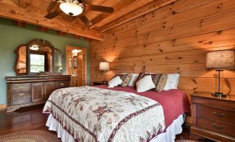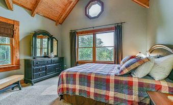 Our Home: Custom 2400 sq. ft. log home nestled in an awe inspiring park like setting. King-sized bed in the master suite with an oversized soaking tub . Queen beds in bedrooms 2 and 3. Two twin self inflating airbeds, and a queen self-inflating airbed available for additional guests. Bedrooms do not have TV's. Living room has 'lodge' decor, TV, stone 'woodstove' fireplace, vaulted craftsman style ceilings, leather furniture and huge windows for bringing the mountains 'in'. Fully appointed kitchen with granite countertops, Jennair downdraft cooktop, microwave, dishwasher, refrigerator/freezer, and wall oven. Media room has flat screen TV with Roku Tv, wet bar, private bath, and porch. Hardwood and ceramic tile floors throughout. Gas grill on spacious deck with furniture for outdoor dining. Wi-fi internet.