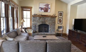 The Living Room has a large sofa, a wood burning fireplace (free wood) Large HDTV/DVR/DVD. Free high speed wireless internet access. Central forced air heat. Washer/Dryer. Two-car garage with ski/snow board racks. Central Living Room, Kitchen and Great Room design keeps you in all the action. Hardwood floors and plush carpet. Dining room table seats 8.