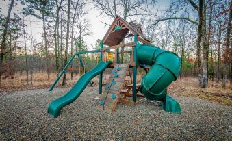 Stepping out to the back deck, you’ll find a place to unwind or even a dip into the new hot tub. The cabin backs right up to nature and Choctaw Nation land which is full of wildlife. The kids can enjoy the playset while the adults take in the fire pit (firewood provided complimentary as a guest convenience). The more adventurous can engage in a round of corn hole, ladder ball or horseshoes as well.