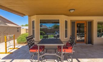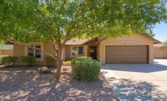 Welcome to Poolside Paradise.  Come and relax in this stylish and comfortable home.  Enjoy your vacation in the large backyard with a HUGE heated, diving pool.  Pool is 35K gallons!  Large, covered travertine patio when you want to be out of the sun, and plenty of space if you want to be in the sun.  Many activities for all ages to enjoy.  Pool toys and floaties included.  New putting green just added.  Close to many restaurants, golf, activities, freeways, stadiums, and shopping.  Full workstation with 2 monitors, keyboard, and docking station. Two king beds.  No carpet in this home!