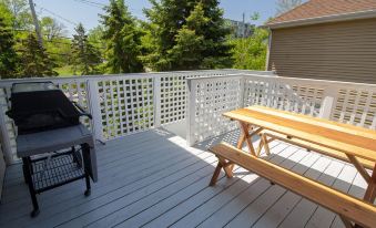 Up the stairs to the second level you have a powder room and the open concept kitchen, living and dining room. This space is furnished with an 85" 4K Ultra HD TV with surround sound and blu-ray player, a sectional sofa that when pushed together makes a big size bed and dining tables with 12 chairs. Access to the 2nd level deck expands your living space even further. Deck includes Weber gas grill, outdoor seating, Sonos sound system and a picnic table for outdoor meals. Kitchen is stocked with the necessary items to prepare and serve meals.