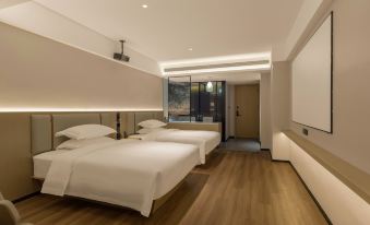 The hotel is located 360 meters north of the intersection of Jingwan Avenue and X014 County Road in the urban-rural integration demonstration zone (downstairs of Longteng Community), adjacent to Nanyang Twelfth Complete School and Nanyang No.1 High School, as well as Henan University of Traditional Chinese Medicine and affiliated hospitals. The surrounding commercial facilities are complete, only 5 minutes' drive from the expressway exit of Nanyang Station, 15 minutes' drive from Nanyang High-speed Railway East Station and 15 minutes' drive from Nanyang Airport. There are shopping malls, government units, green parks and leisure and entertainment venues near the hotel. Supporting banks, convenience stores, pharmacies, food and so on. The hotel has a variety of room types for you to choose from. The whole room is controlled by AI intelligent guest. You can control TV, air conditioner, lighting and curtains with a small call to give you a super comfortable "home" experience. The movie and television room adopts a hundred-inch giant screen, which brings a refreshing perspective shock. The rooms are decorated in a luxurious and simple style. The zero-pressure sleeping latex mattress, massage shower system, star-rated hotel toiletries and Gigabit high-speed Internet give people a feeling of returning to nature. The interior decoration is elegant, generous, clean and comfortable, which is in obvious inverse proportion to the long-term noisy city, and often makes the guests linger, leaving aside the trivial things around them and feel more peaceful. The lobby is simple and transparent, and the front desk service staff is warm and polite, which makes people feel.