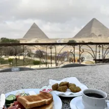 من أعلى السطح يمكنك رؤية الأهرامات وأبو الهول أمامك مباشرة، إنه منظر مذهل. يتوفر بوفيه الإفطار على السطح وكان لذيذًا مع الكثير من التنوع. تتوفر خدمة ذاتية للمياه والشاي والقهوة مجانًا على مدار 24 ساعة يوميًا.
